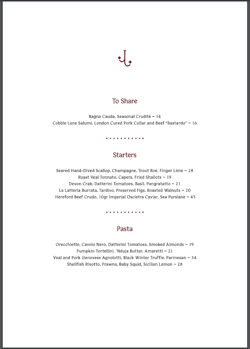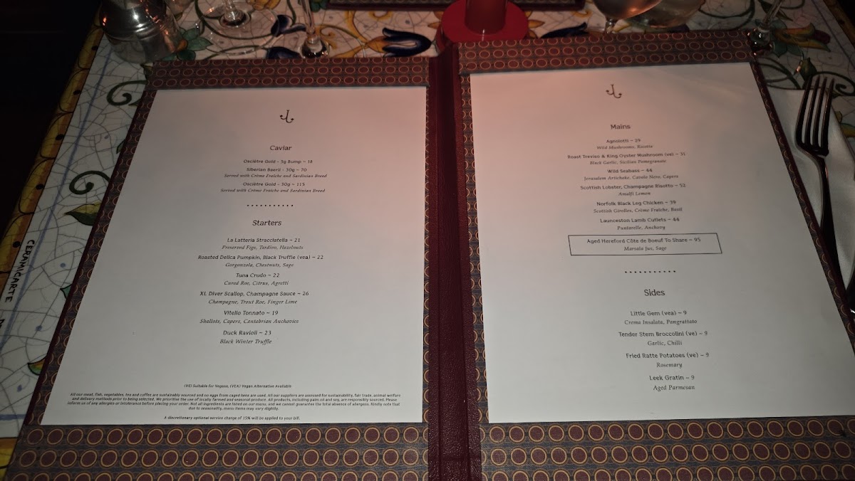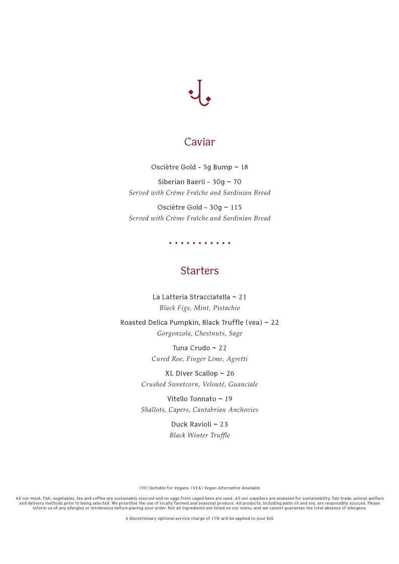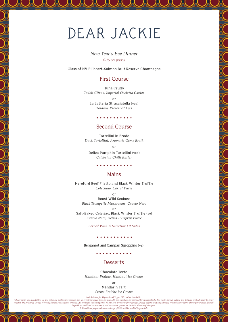 At Dear Jackie on Lower Ground, 20 Broadwick Street, the menu reads like a curated journey through refined flavors and playful textures. Starters such as La Latteria Stracciatella, Roast Veal Tonnato, Capers, Fried Shallots, and Roasted Delica Pumpkin, Black Truffle (vea) set a sophisticated tone, while seafood options like Tuna Crudo and XL Diver Scallop highlight freshness and precision. Mains impress with dishes like Agnolotti, Violet Aubergine (ve), Wild Seabass, Scottish Lobster, Champagne Risotto, and Norfolk Black Leg Chicken, balancing indulgence with seasonal ingredients. Complementary sides, including Little Gem (vea), Purple Sprouting Broccolini (ve), Fried Ratte Potatoes (ve), and Leek Gratin, provide vibrant contrasts that elevate the meal. Desserts are equally enticing: Amaretto Tiramisu, Olive Oil and Ricotta Cake, Black Cherries, Crème Fraîche, 70% Dark Chocolate Mousse, Hazelnut Praline, Salted Cream, Blood Orange Sorbet, Chilled Campari, and the House Gelato & Sorbet Selection round out the experience with elegance and creativity. Even the caviar offerings, from Osciètre Gold - 5g Bump to Siberian Baerii - 30g and Osciètre Gold - 30g, underscore the restaurant’s commitment to luxury. Overall, the menu blends classic techniques with modern flair, creating a dining experience that is both memorable and meticulously crafted.