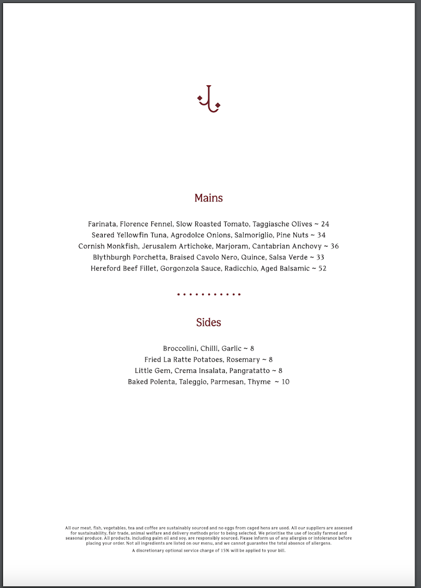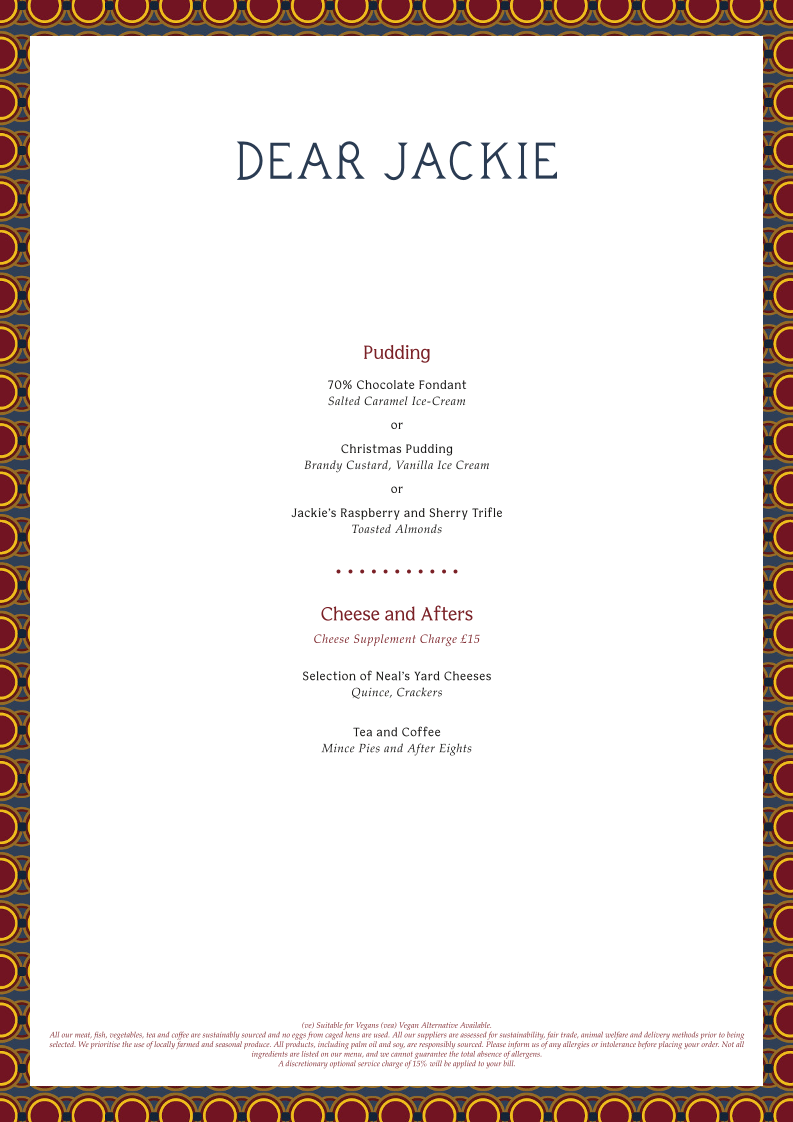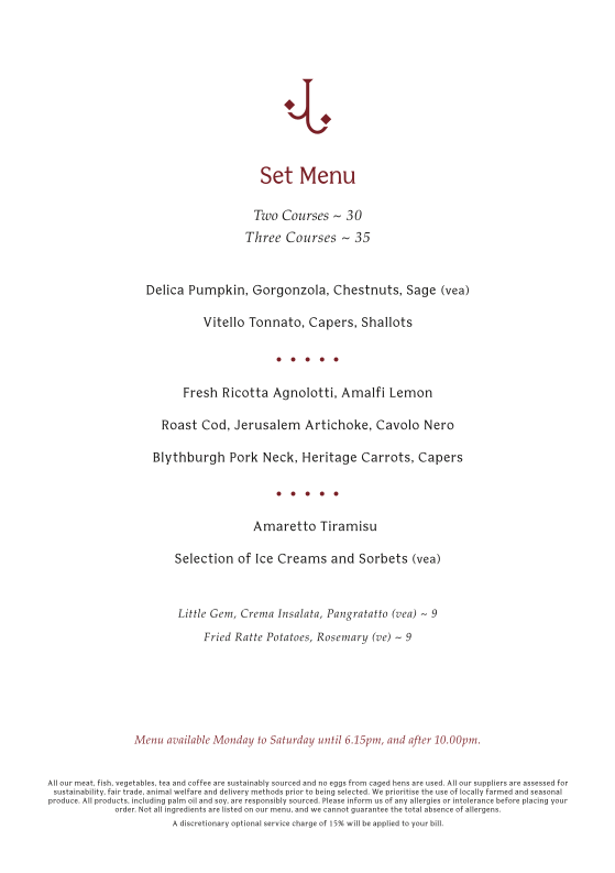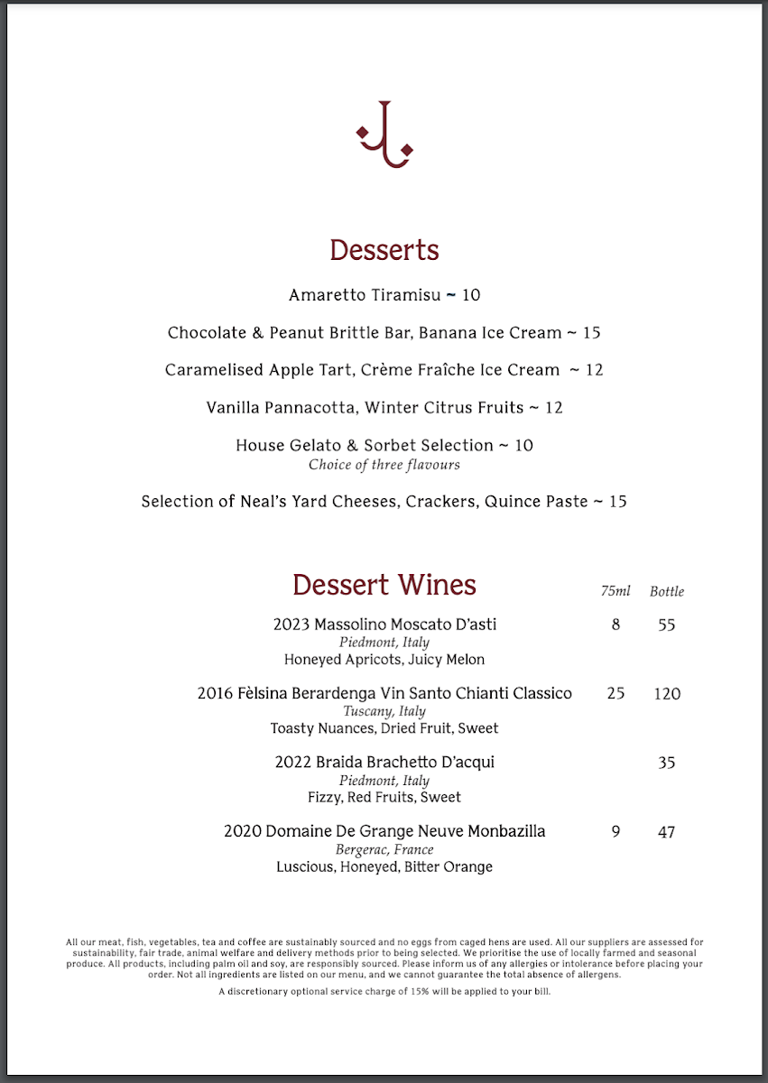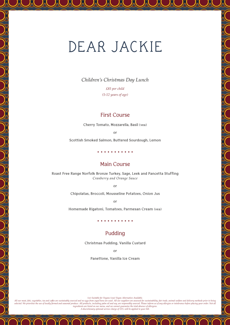 At Dear Jackie on Lower Ground, 20 Broadwick Street, the menu reads like a curated journey through refined flavors and playful textures. Starters such as La Latteria Stracciatella, Roast Veal Tonnato, Capers, Fried Shallots, and Roasted Delica Pumpkin, Black Truffle (vea) set a sophisticated tone, while seafood options like Tuna Crudo and XL Diver Scallop highlight freshness and precision. Mains impress with dishes like Agnolotti, Violet Aubergine (ve), Wild Seabass, Scottish Lobster, Champagne Risotto, and Norfolk Black Leg Chicken, balancing indulgence with seasonal ingredients. Complementary sides, including Little Gem (vea), Purple Sprouting Broccolini (ve), Fried Ratte Potatoes (ve), and Leek Gratin, provide vibrant contrasts that elevate the meal. Desserts are equally enticing: Amaretto Tiramisu, Olive Oil and Ricotta Cake, Black Cherries, Crème Fraîche, 70% Dark Chocolate Mousse, Hazelnut Praline, Salted Cream, Blood Orange Sorbet, Chilled Campari, and the House Gelato & Sorbet Selection round out the experience with elegance and creativity. Even the caviar offerings, from Osciètre Gold - 5g Bump to Siberian Baerii - 30g and Osciètre Gold - 30g, underscore the restaurant’s commitment to luxury. Overall, the menu blends classic techniques with modern flair, creating a dining experience that is both memorable and meticulously crafted.
